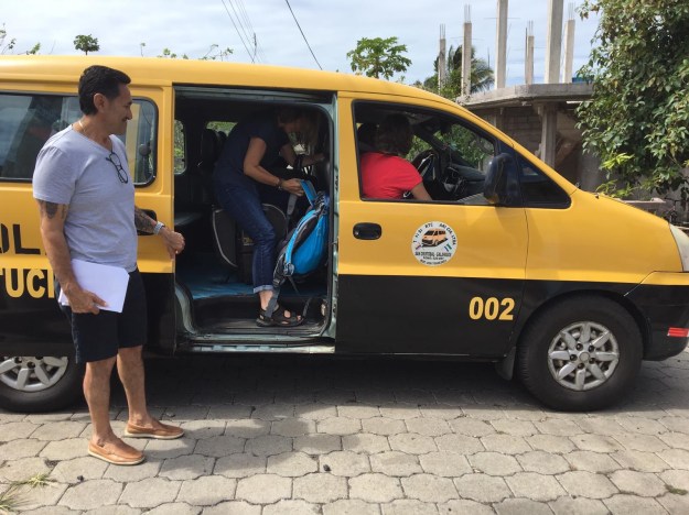 Das eine Musketier beim Einstieg in den Schulbus, mit dem wir immer zu unseren Einsätzen und nun auch zum Flughafen gebracht wurden, unter Assistenz von William, dem Leiter des Projektes, der mit Herzblut, riesigem Einsatz und punktgenauer Organisation aller Kräfte für die Verbesserung der Lebens- und Bildungssituation in der Kommune und den Erhalt der einzigartigen Natur auf den Inseln kämpft