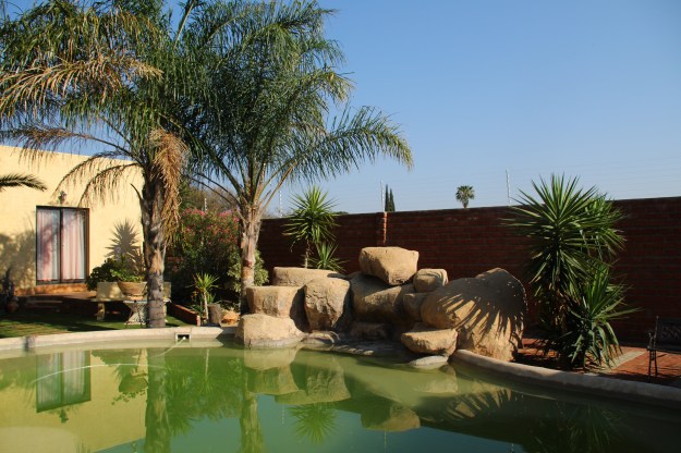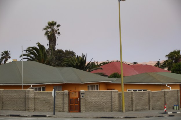 Schon auf dem Weg in unsere Unterbringung fiel auf, dass die Einmauerung der Häuser in Windhoek noch ausgeprägter ist als in Kapstand, sollte Trump noch einen geeigneten Architekten für sein Mauerprojekt suchen, träfe er hier auf viel Erfahrung. Ein bisschen hatten wir das Gefühl, an einem riesigen Knast entlangzufahren. Auf den Fotos von unserem ansonsten wirklich schönen B & B ist das auch erkennbar.
