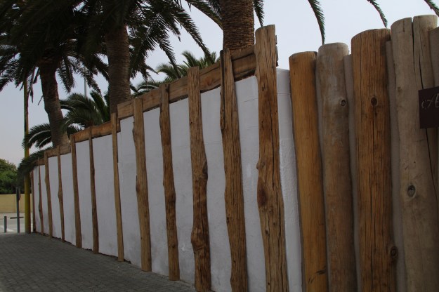 Auch in Swakopmund scheint, trotz des Badeortcharms, genügend Kriminalität zu geben, um den Bau von wehrhaften Mauern um die Grundstücke zu motivieren. Eine ästhetische Gestaltung ist den Architekten des Altstadtrestaurants (heißt wirklich so) gelungen, hier wurden Holzelemente in den Schutzwall eingebaut.
