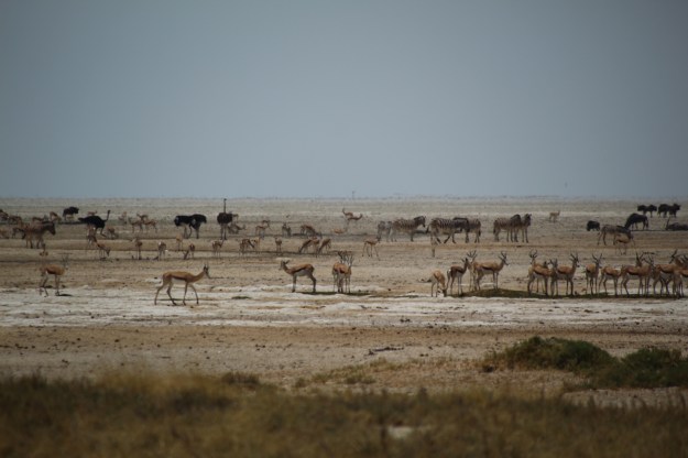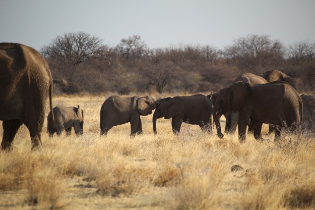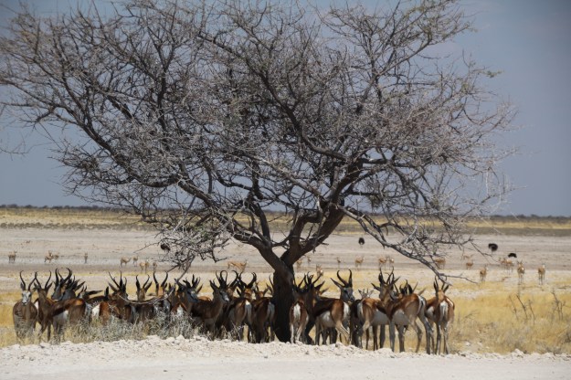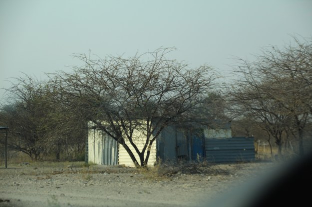 Unsere Unterkunft ist nicht im Park, sondern nördlich außerhalb der riesigen Anlage, weniger aus Bescheidenheit, vielmehr war bei unserer Buchung im Park schon alles ausgebucht. Eigentlich finde ich es aber prima, in einem ganz normalen Dorf, Omuthiya, zu wohnen. Die Unterkunft ist, wie immer, martialisch gesichert, aber zumindest Einkaufen, Tanken und Geld abheben geschieht mitten im ganz normalen afrikanischen Alltag. Auf dem Weg in „unsere“ Stadt, die insb. jetzt am Wochenende voller Leben ist, sehen wir auch einiges. Zum Beispiel sehr viele Wellblechhütten-Siedlungen, die einfach auf den Acker gebaut sind, ich kann mir nicht vorstellen, dass es dort eine gesicherte Strom- und Wasserversorgung gibt.