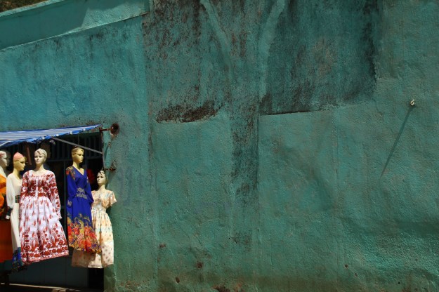 Ein typischer Kleiderladen vor grüner Mauer