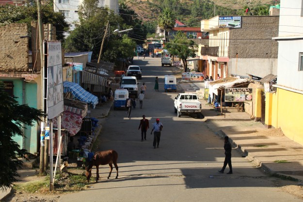 Blick aus meinem Hotelfenster mitten in der Stadt. Man beachte das Pferd im Vordergrund.
