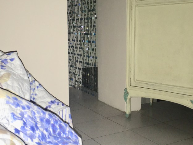 Dort, wo diese Schnüre mit Perlen hängen, geht es ca. 2 m runter in den Flur, die Wohnung ist sehr hoch und an dieser Stelle wurde die Höhe genutzt, um eine zweite Ebene einzuziehen. Dort ist mein Zimmer und immerhin eine eigene Toilette, aber aus Licht- und ästhetischen Gründen wurde nicht alles zugemauert. Ein Grund, nicht zuviel Wein zu trinken, den von der Toilette aus geht man direkt auf diese potentielle Absturzstelle zu.