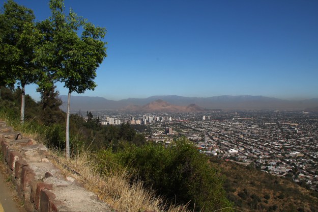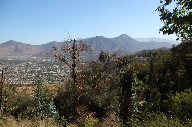 Da die alte Zahnradbahn, deren Bodenstation in Hostelnähe ist, nicht bereit war, so früh wie ich zu starten, bin ich also zu Fuß bergan gestapft … bis ein Souvenirverkäufer mich aufhielt und mir auf Spanisch erklärte, das ginge ja nun gar nicht, eine Frau alleine mit Kamera, Armbanduhr und Flatterkleid den Wanderweg hoch, viel zu gefährlich, muy pericoloso! Zur Absicherung befragte ich dann noch eine Parkmitarbeiterin, die meinte, das könne schon sein so früh am Morgen, aber ich könne ja den etwas längeren Weg die Straße entlang nehmen. Das tat ich dann auch und kam mir ziemlich blöd vor, außer mir waren nur Jogger und Radfahrer (es ging wirklich steil bergauf, dafür waren es verdammt viele) unterwegs. Aber die Ausblicke waren spannend, Santiago ist, zumindest aus der beschriebenen Perspektive, nicht schön, aber groß und von Bergen umgeben.
