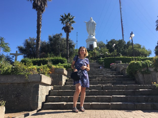 Nach dem faulen Abend gestern im Hostelhof habe ich mich heute morgen auf den Weg gemacht, den für den hiesigen Ausblick zuständigen Hügel zu erklimmen, und zwar ziemlich früh morgens, um der Hitze zu entgehen. Das Bergchen heißt San Cristobal und ist oben 880 m ü.d.M., da Santiago auch schon bei ca. 700 m angesiedelt ist, hält sich der Höhenunterschied in Grenzen. Oben ist eine riesige Marienstatue und eine schöne Kirche.